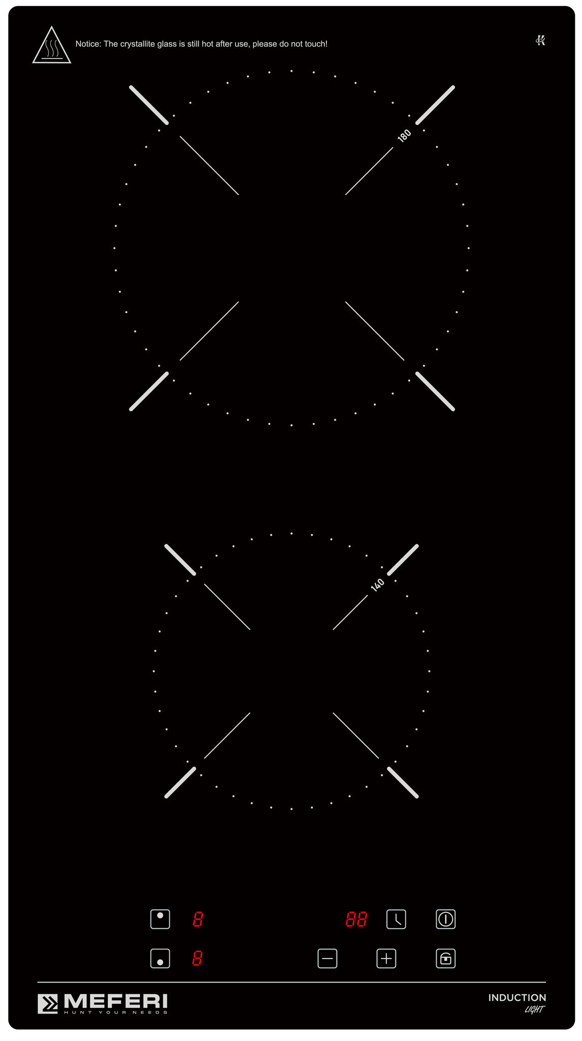 • Индикатор остаточного тепла: Этот индикатор позволяет вам видеть, какие конфорки все еще горячие после приготовления, обеспечивая безопасность и экономию энергии.
