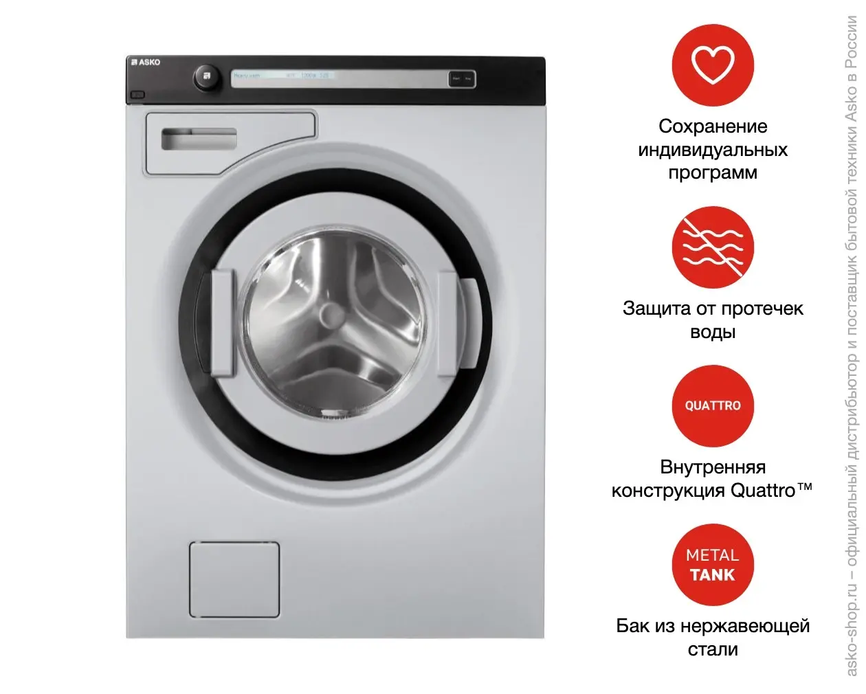 Стиральная машина Asko WMC643PG относится к профессиональному оборудованию и вмещает до 6 кг белья. Предназначена для мини-гостиниц, кафетериев, небольших спа-салонов. Внутренняя конструкция бака Quattro оснащена 4 амортизаторами, которые обеспечивают устойчивость и надёжность устройства. Благодаря этому, а также индукционному мотору, достигается малый уровень вибраций при отжиме, что сокращает уровень шума и увеличивает срок эксплуатации. Прибор предлагает 28 различных режимов, распределённых по типу ткани, особенностям применения, цвету, а также возможной температуре. Стиральная машина Аско WMC643PG надёжно защищена от протечек благодаря AquaBlockSystem.